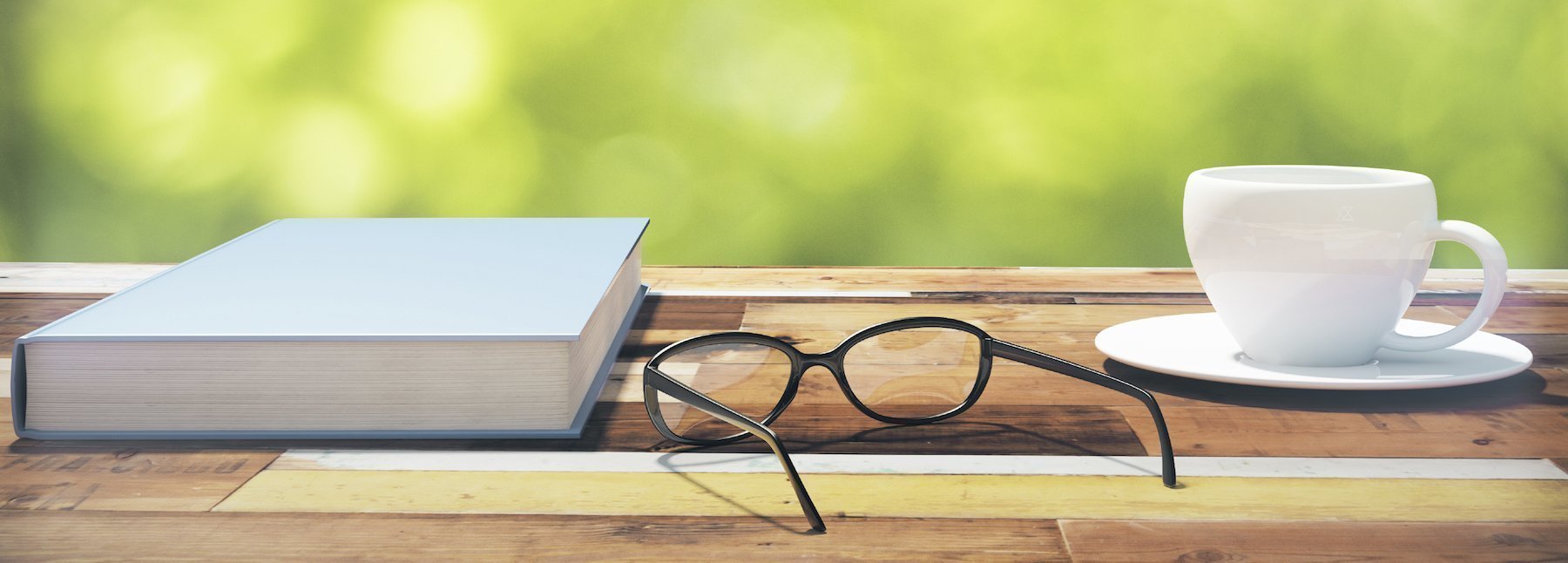 Book, cup of coffee and eyeglasses on a vintage wooden table in nature