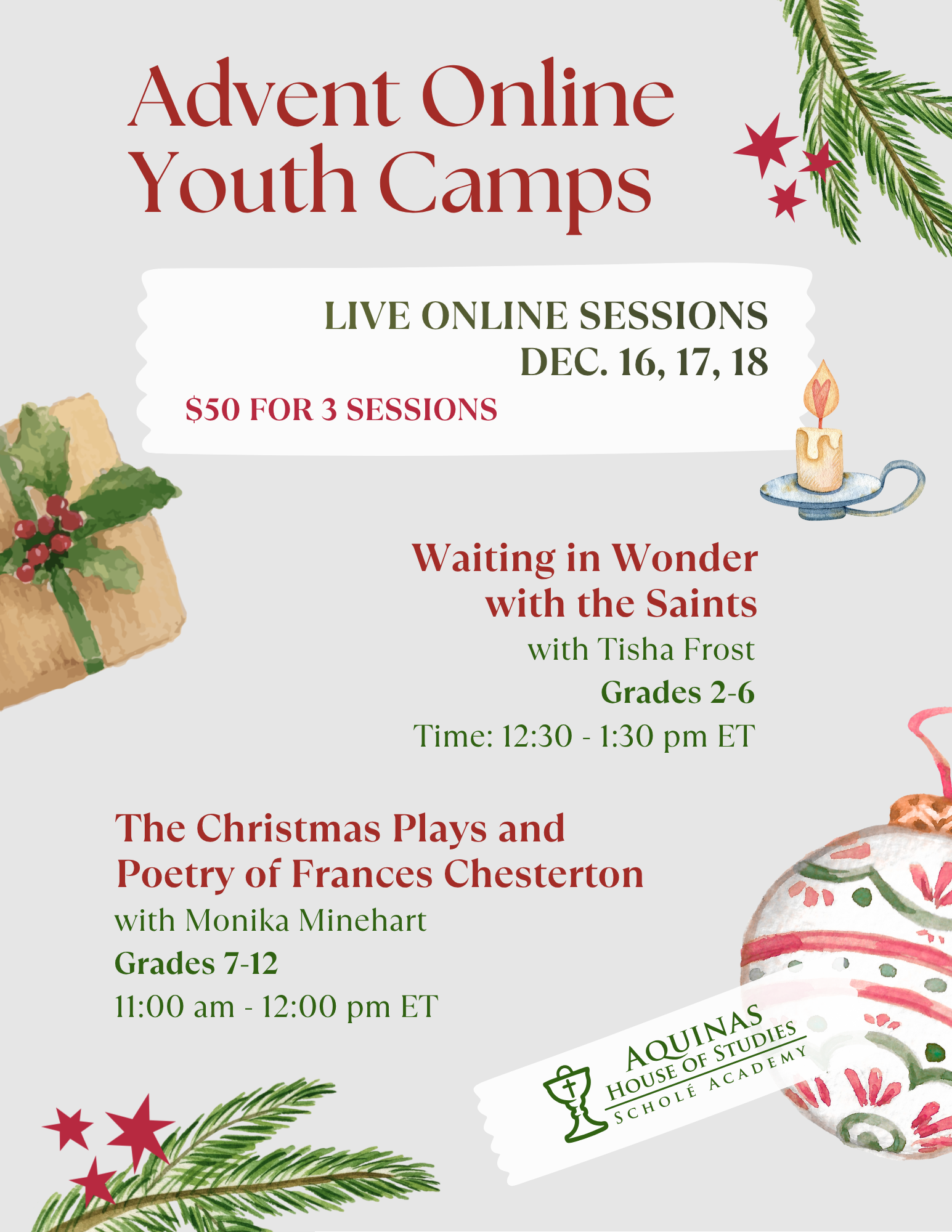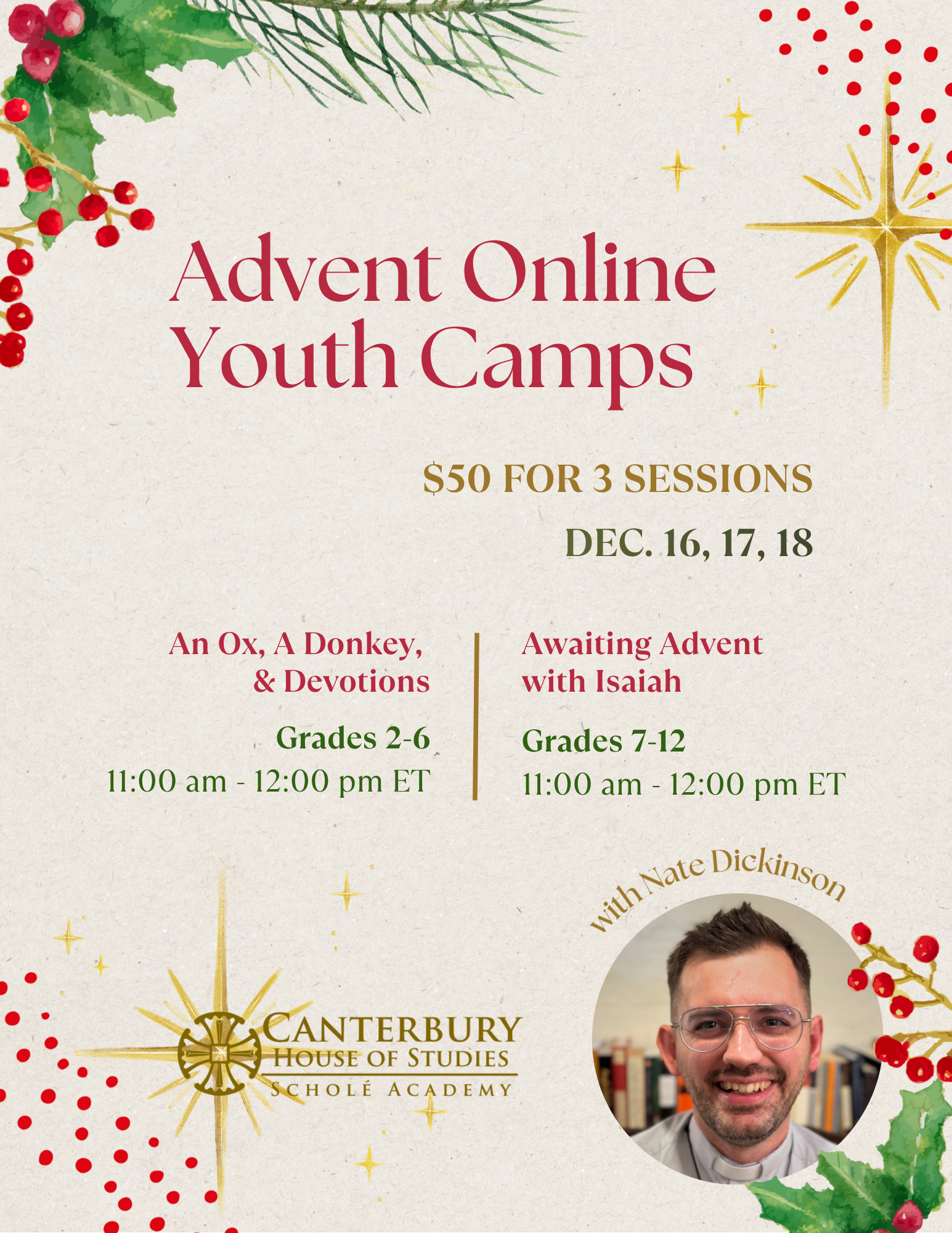 Special 3-Day Camps | December 2024 Camps with St. Raphael School Grades K-3 Feast of the Nativity Picture Books Grades 1-5 Honoring St. Nicholas: Crafting His Peg Doll in the Orthodox Tradition The Earth Offers a Cave- Building the Nativity with LEGO. A Workshop on the Mystery of Christ’s Birth. Grades 4-8 Book Club: The Birds' Christmas Carol Nativity Escape Room Grades 6-12 Book Club: The Gift of the Magi Good Day, Noble Friends – Greek Christmas: Carols, Chants, and the Poetry of Palamas Grades 8-12 Hymns of the Forefeast of Nativity Camps with the Aquinas House of Studies Grades 2-6 Waiting in Wonder with the Saints Grades 7-12 The Christmas Plays and Poetry of Frances Chesterton Camps with the Canterbury House of Studies Grades 2-6 An Ox, a Donkey, and Devotion Grades 7-12 Awaiting Advent with Isaiah Explore Our Courses! All Courses By House By Grade
